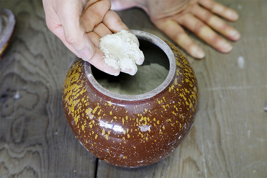 「宮島御砂焼は、粘土に御砂を練り込み制作する素朴な焼き物です。現在続いている宮島御砂焼は、大正元年頃に宮島の対岸で再興しました。以前は宮島島内にあり、何度も途絶えた御砂焼で、当時はお土産を主に制作していたと考えられます。先代と私自身も、現存する御砂焼から感じられる素朴な自然観や、昔の旅人から始まった御砂を拝受できることへの感謝の気持ち、そして厳島神社から拝受した御砂を練り込んで制作する伝統は代々変わらず、心に刻みながらも表現方法は変わってきています。対厳堂の御砂は神職様にご準備、ご祈祷いただいています。お客様にとっては縁起物であり、私たち作り手にとってはありがたい御砂です。御砂を粘土に練り込む時は最も気持ちが引き締まります」