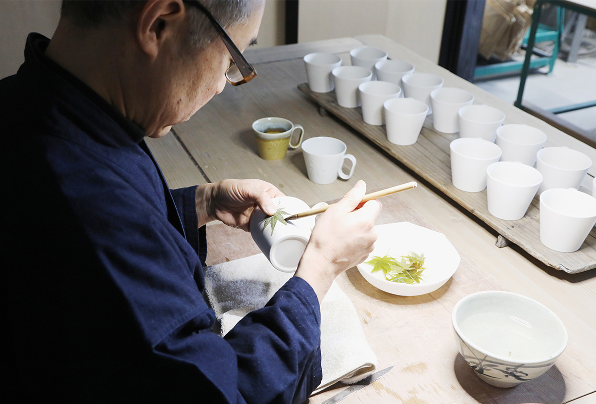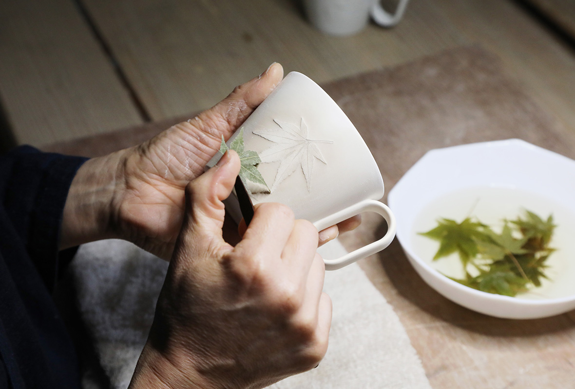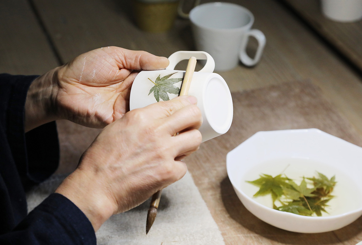 「陶器と磁器では、紅葉の貼り方や彫り方が異なります。磁器だからこそできる、もみじ紋の表現を目指しました」