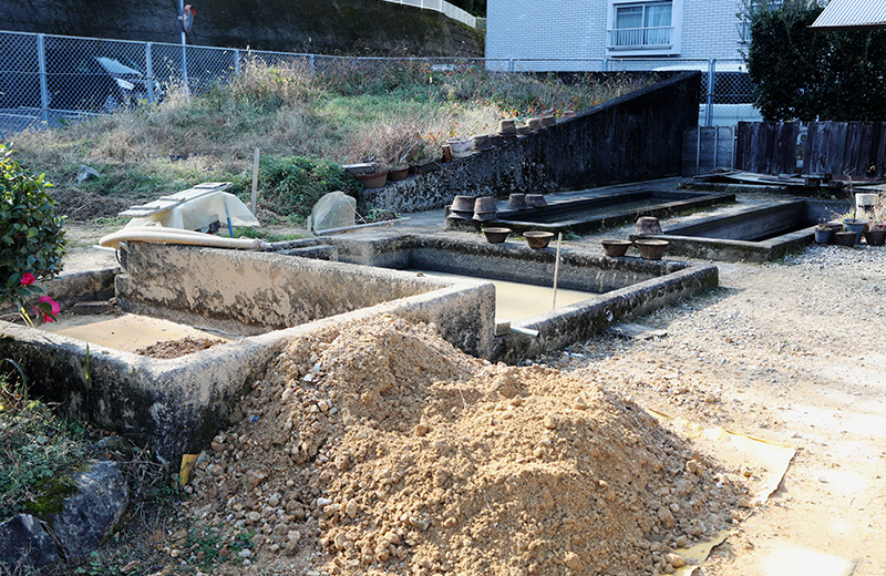 工房から歩いて行ける距離の山へ自ら足を運び、掘り出した土を水に溶かし、砂や石を分離し、何度も濾過を重ね、陶土へと仕上げていきます。