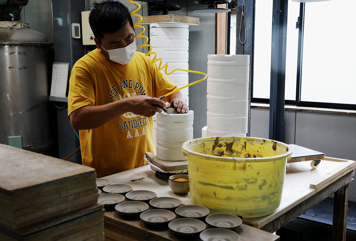 島倉さんが3代目を継承して35年。伝統の手仕事を守り、その技術を絶やさないために若手の職人を育てつつ、新社屋を建て、最新の設備を導入したことで、竹堂園は業績を伸ばしてきました。さらに、品野陶磁器工業協同組合の理事長を務めるなど、産地の発展に尽力されてきました。“温故知新”のバランス感覚に優れた経営者という印象です。